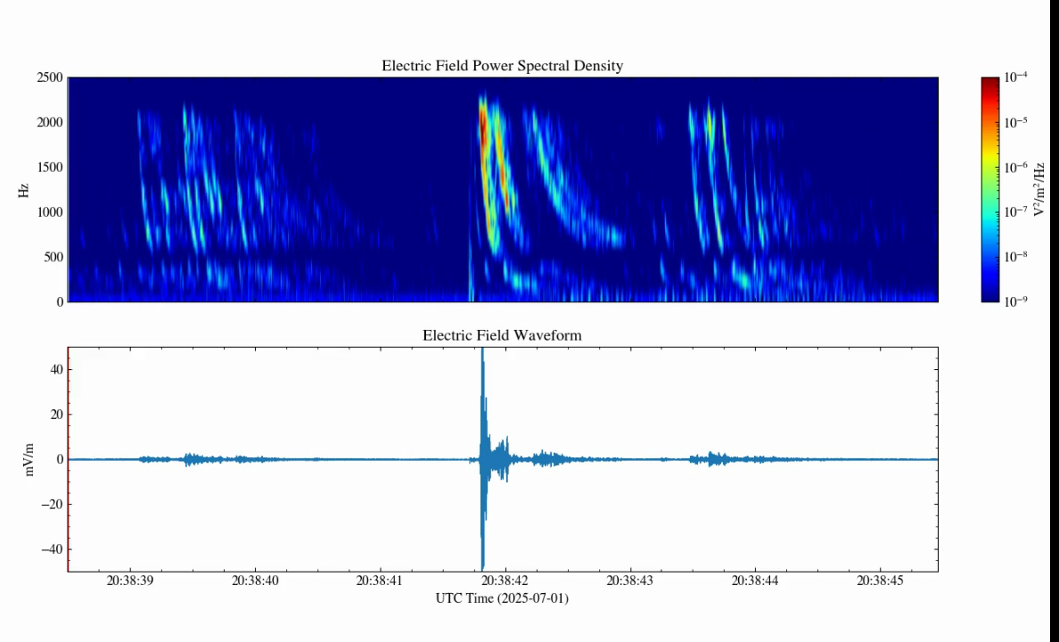 A detection of a “whistler”: the electromagnetic echo of a lightning strike traveling through space. The EFD-02 instrument measures its decreasing frequency, a signature that makes the signal resemble a descending whistle.